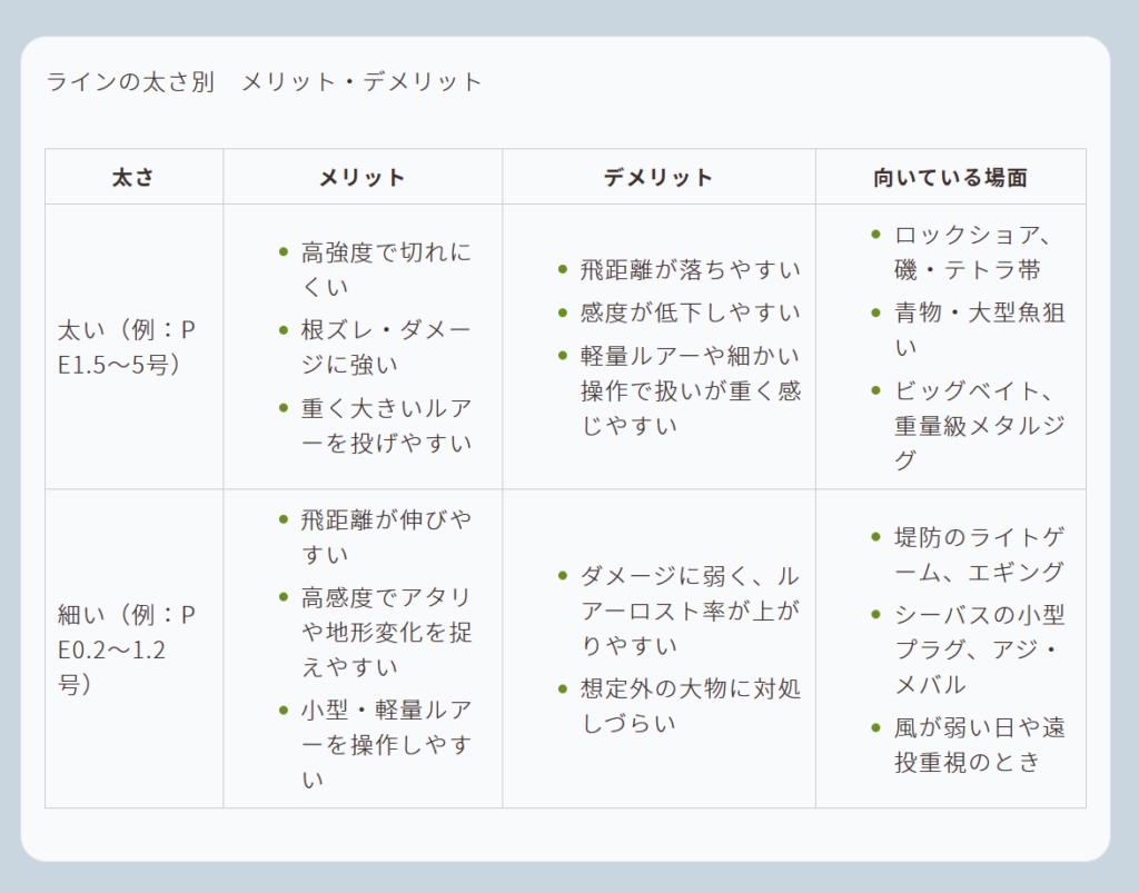 基本的にPE0.6~1.0号前後に適合したロッドをオススメします。これはお店なら竿の箱に書いていますし、ネットでもスペックのところに100%表記されています。