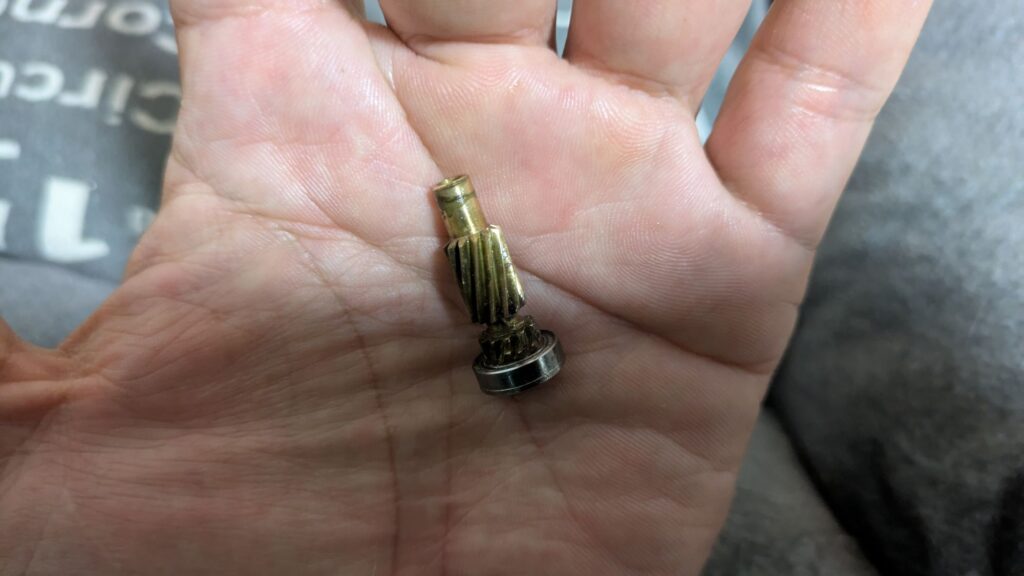 このギアがベアリングにぶっ刺さって固着しているのが原因でした。これを無理くり引き抜いて掃除してグリスアップしたらスポスポ抜き差しできるようになり、クラッチが正常に動作するようになりました。