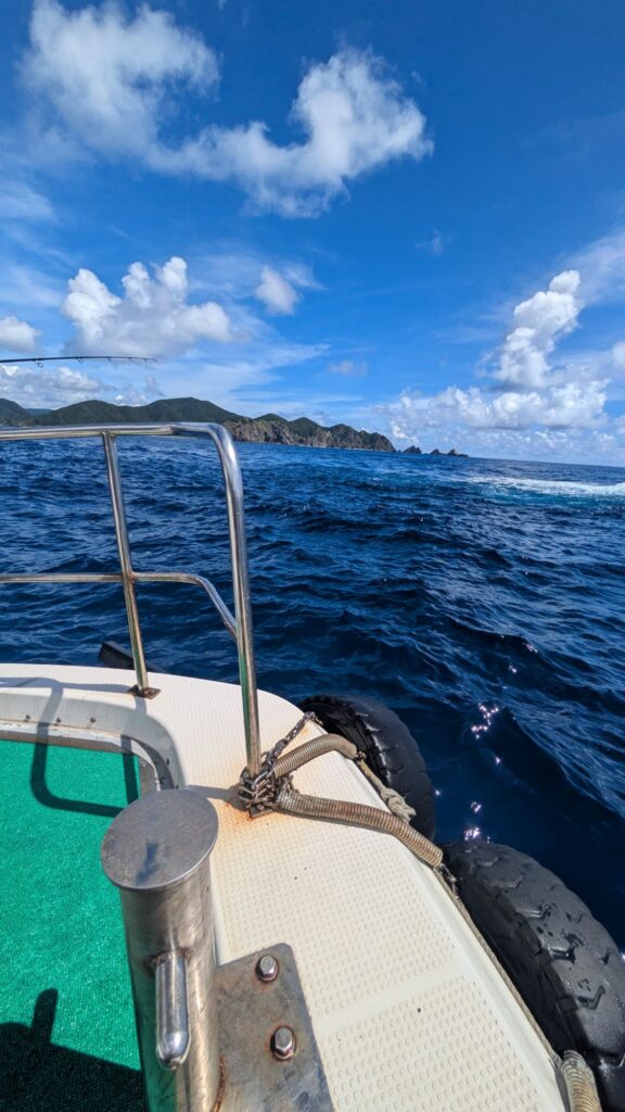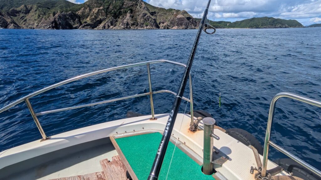 集合して早速沖にでると、やはり大島海峡は潮の動きというか色というか、なんかワクワク感がある。まあ単純にいつも自前の小さいボートで遠出できないからってのもありますが。