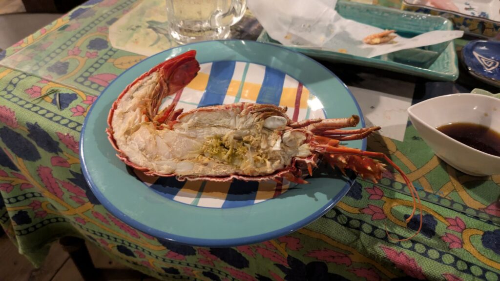 晩飯で出た伊勢海老の丸焼きですが、この割り方で食べるのは初めて。ここまで身が詰まっているのが見てわかるし、食べやすくて最高でした。