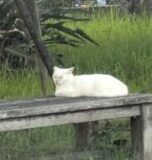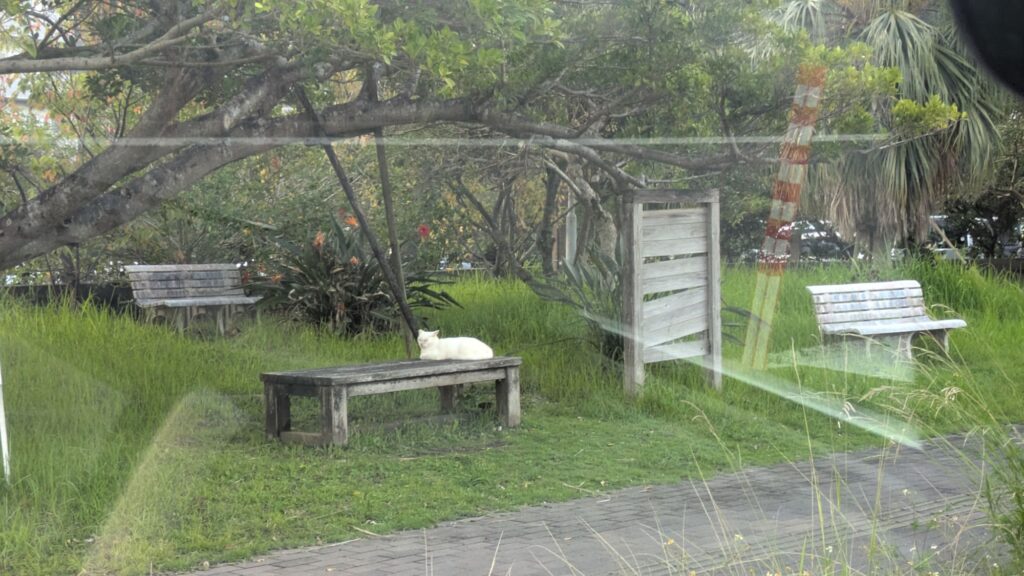 ずっと前から気になっている、フェリー乗り場前の椅子によくいるこの白い猫。勝手に命名したいと思います。