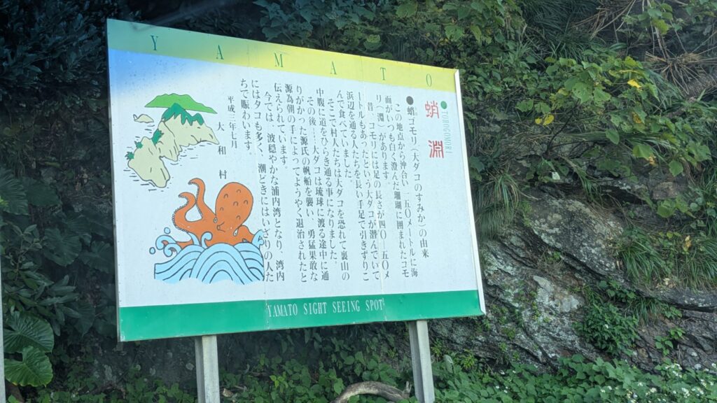これは大和村津名久に伝わる大ダコ伝説に関する看板。足の長さが40~50mあったそうですが、源為朝という人が退治したそうです。ここに限らずですが、島は源平関連の言い伝えや施設がやたら多い。