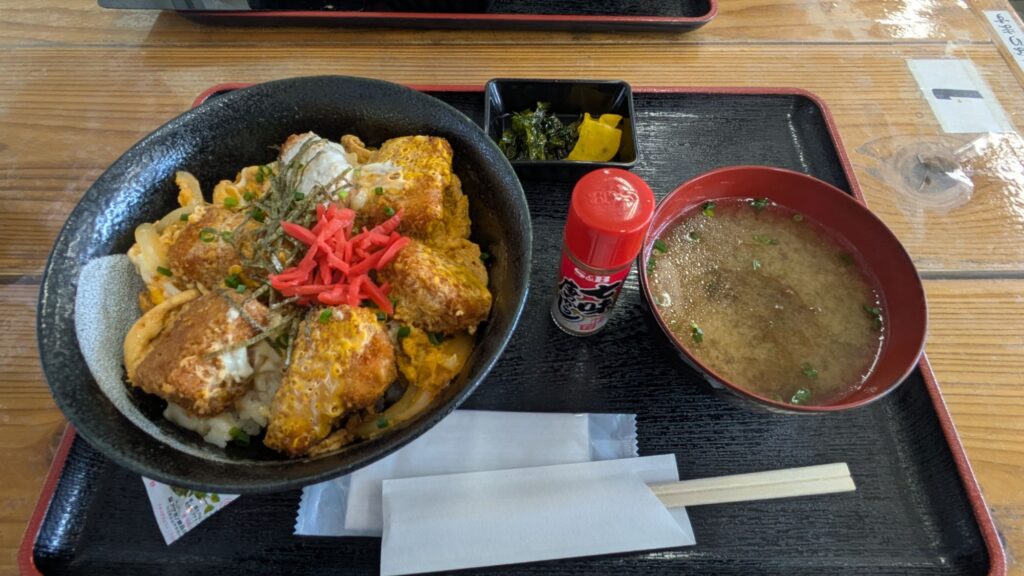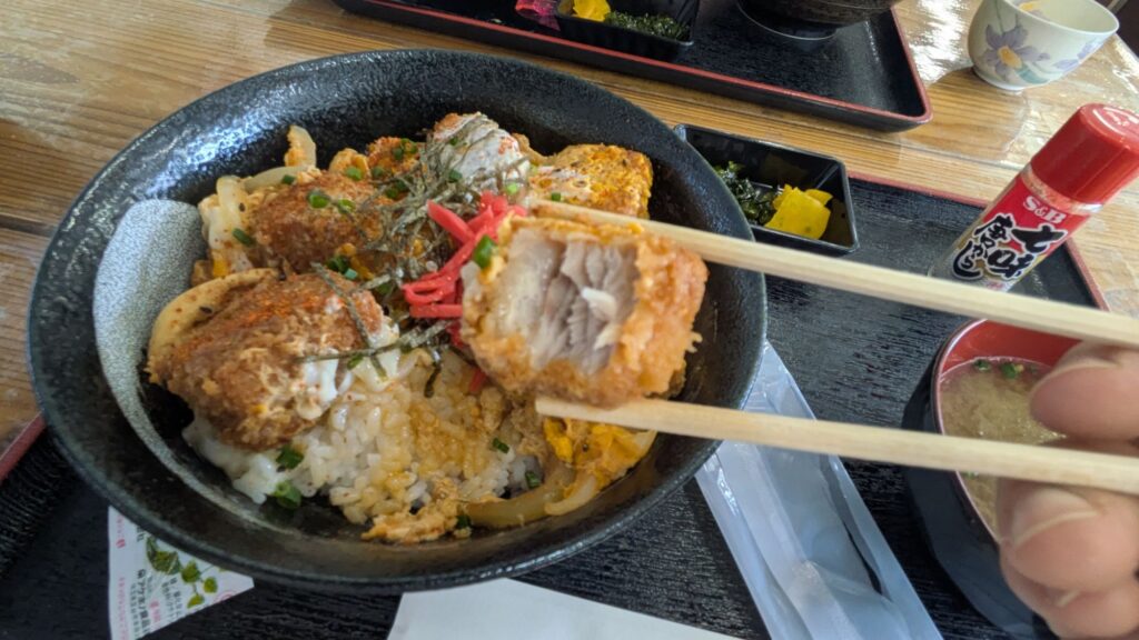 シビカツ丼。このシビが思ってた倍ぐらい肉厚で食べ応えもありgood。味噌汁が魚の出汁&エビの出汁をミックスしたような味で激うま。