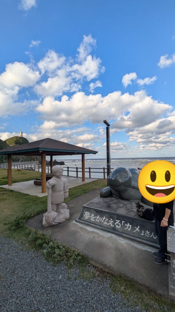 最北端の夢を叶えるカメ&灯台。カメの頭、手足を触ると、それぞれの部位に設定されている夢が叶うとの事。母は全部位触ってました。