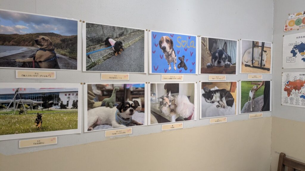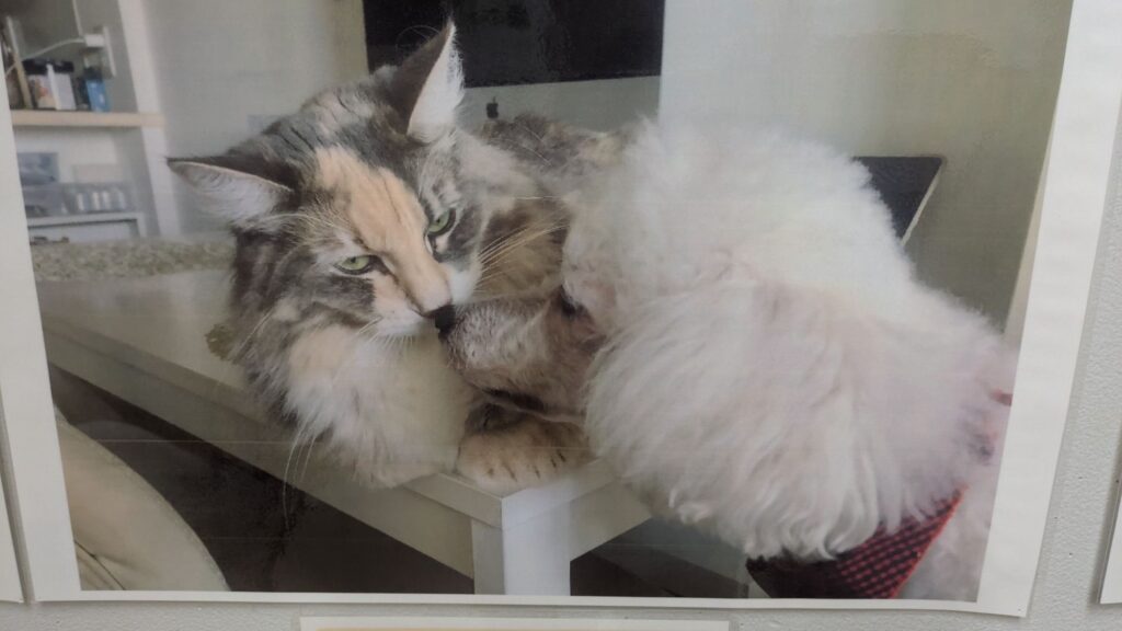 のはずが、写真中央の1匹だけどう見ても猫。犬っぽいぐらい大きい品種(ノルウェージャンフォレストキャット?)だから特別枠かな~と思ってよく見たら。