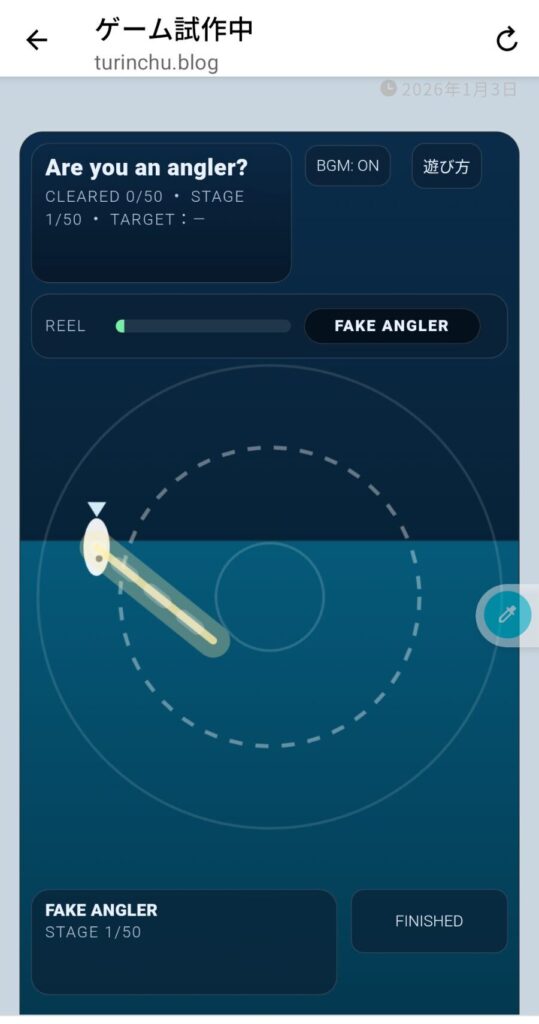 ゲーム制作 釣りゲームつくってみました『THE ANGLER』 turinchu 2026年1月10日 人生初となるオリジナルゲーム作ってみました。その名も 『THE ANGLER』 実際のプレイ画面は投稿を分けます。 ・50ステージ ・ランキング登録可能 ・ライン最大長を超えるとラインが切れます。 ・円の外に一定時間逃げられるとフックオフします。 ・スコアをツイッターで共有できるので、おっ!と思っていただけたら是非シェアよろしくお願いいたします。